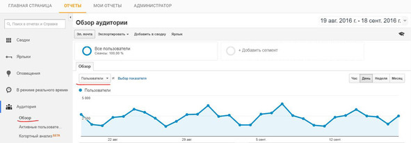 Заходим в раздел «Аудитория → Обзор Аудитории». По аналогии с Я. Метрикой можно посмотреть статистику по Пользователям или Сеансам (плюс предусмотрено много другого функционала, о котором обязательно расскажу в другой раз).