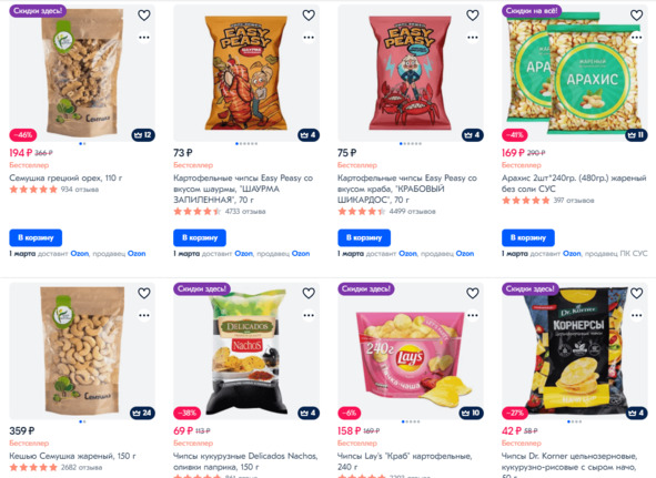 – Снеки (чипсы, орехи, сухарики, попкорн)