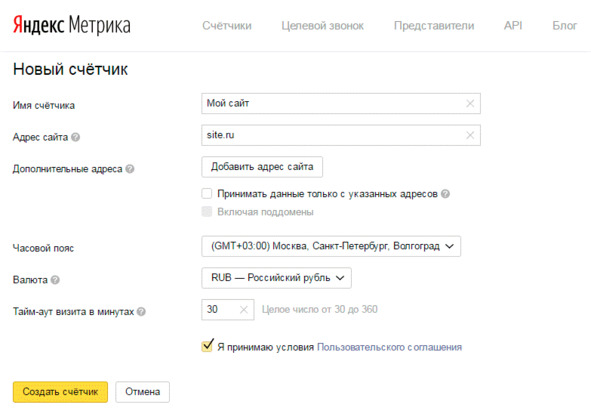 Затем необходимо заполнить поля «Имя счетчика» и «Адрес сайта», выбрать часовой пояс, принять условия пользовательского соглашения и нажать «Создать счетчик»: