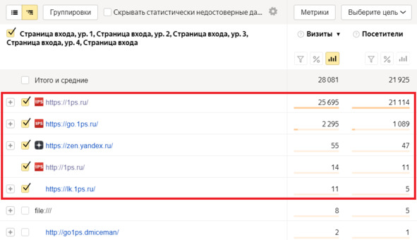 Галочка «Принимать данные только с указанных доменов» ставится, когда в отчетах есть данные посторонних сайтов. Например, это видно в отчете «Содержание → Страницы входа»: