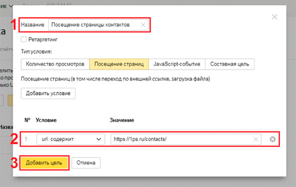 Например, мы хотим узнать, сколько пользователей заходит на страницу контактов: https://1ps.ru/contacts/. Для этого: