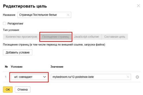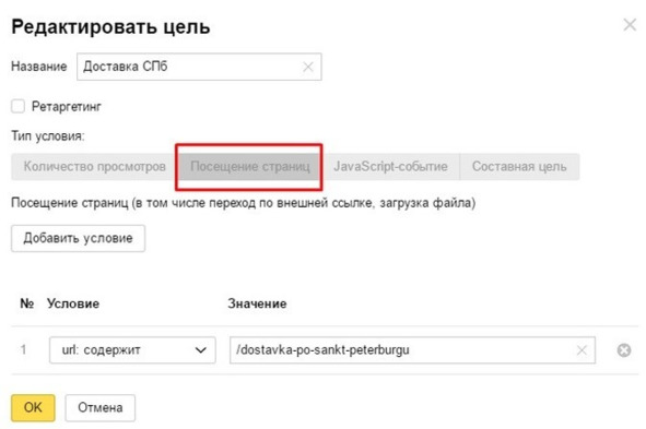 В настройках указываем страницу целиком, либо «кусочек» адреса после разделителя «/». Страницы в этой цели объединяются условием «ИЛИ», то есть цель будет достигнута, если будет посещена хотя бы одна страница из указанных в настройках.
