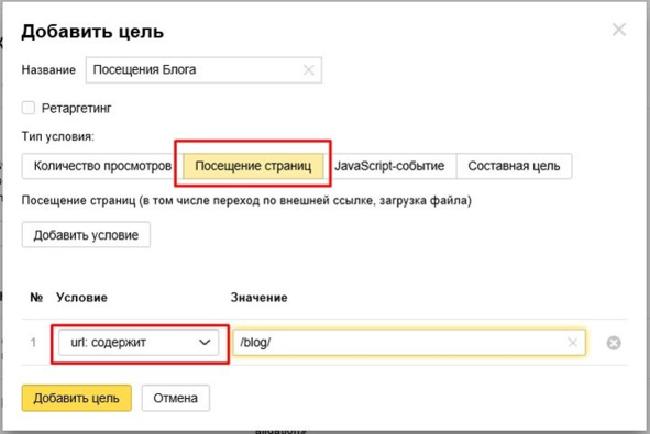 Затем в поле «Условие» выбираем «url: содержит» и справа указываем полный адрес страницы. Если же у нас раздел с контактной страницей делится на подразделы, и мы не хотим, чтобы собирались данные по подразделам, лучше выбрать параметр «url: совпадает».