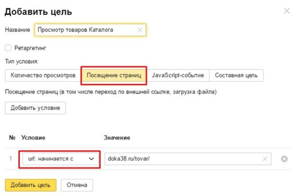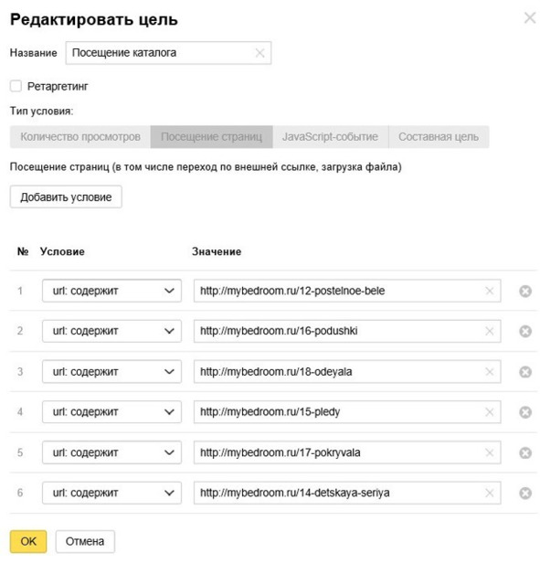 Бывают сайты, на которых разделы Каталога имеют разные адреса и у них нет ничего общего. Тогда данный тип цели можно использовать, чтобы понять, как часто посещают разделы и карточки Каталога.