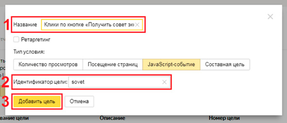 yaCounter12345678.reachGoal('sovet'), где 12345678 – номер вашего счетчика, который указан вверху страницы Метрики.