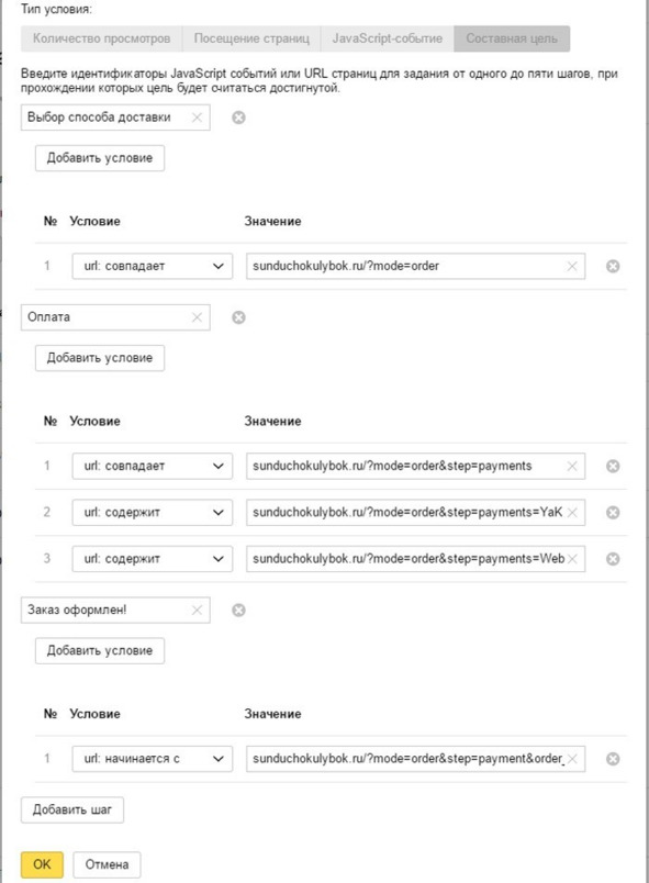 Данная цель как некий конструктор, где каждый шаг – это цель вида «Посещение страниц» или «JavaScript-событие». В отчетах вы также сможете увидеть данные отдельно по каждому шагу. Максимальное количество шагов – 5, поэтому если у вас на сайте процесс выполняется в больше этапов, то стоит разбить его на несколько составных целей.