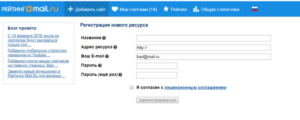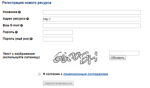 3. В форме заполняем поля «Название», «Адрес ресурса», «Пароль», «Пароль (ещё раз)». Поле «Ваш E-mail» обычно уже заполнено автоматически (если Вы авторизованы). Далее нажимаем галочку возле пункта «Я согласен с лицензионным соглашением» и нажимаем кнопку «Зарегистрироваться».