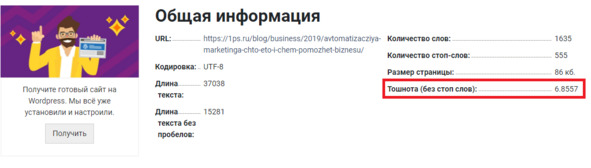 Как мы видим, «тошнота» контента на странице равна 6,8%, это хороший показатель. Заметим, что пределом для этого показателя является уровень в 8%. То есть «тошнота» в 10% и выше дает поисковику основания считать текст переспамленным.