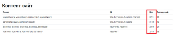 Список «Слова». Если продвигаемое слово попало в этот список и не вошло в список «Семантическое ядро», то частота вхождения недостаточная. Для оптимизации текста под это слово необходимо увеличить его количество в тексте.