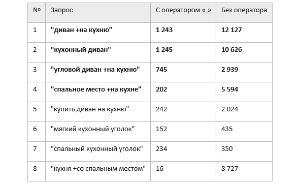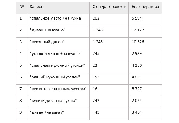 Зачем нам 2 значения статистики (с оператором «» и без)? Если мы правильно оптимизируем статью под запрос «диван на заказ», то высока вероятность того, что, впечатав эту фразу в поиск, пользователь увидит нашу статью, потому что она будет полностью релевантна запросу. Но, если он впечатает фразу «пошив диванов на заказ», то в первую очередь будут показываться сайты, где есть именно эта фраза. Наша же статья, в которой такого сочетания нет вообще, может попасть в ТОП, а может и не попасть – зависит от уровня конкуренции. Таким образом, мы смотрим, сколько показов нам «гарантировано» и сколько потенциально возможно. В случае с «диваном на заказ», оптимизируя статью под этот запрос, мы ставим цель получить минимум 449 показов в месяц, максимум 3 464.