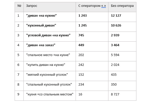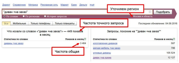 Статистику смотрим как с оператором «» (кавычки), так и без него. В первом случае показывается частота точного запроса – сколько раз искали фразу «диван на заказ» и ни словом больше. Во втором случае показывается общая частота запроса – сколько раз искали фразы, которые включали в себя словосочетание диван на заказ. Это могли быть фразы «диван на заказ Москва», «диваны на заказ недорого», «пошив диванов на заказ» и т.д.