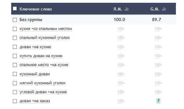 Один из интересующих нас ключей «диван на заказ» есть в топе Google. Под этот запрос уже существует целевая страница на сайте. Не будем вносить сумятицу и исключим данный ключ из нашего списка. Просто порекомендуем владельцу сайта провести дополнительную оптимизацию данной страницы, чтобы вывести её в ТОП Яндекса, а не только Google.