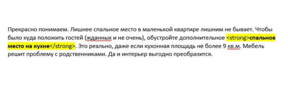 Давайте рассмотрим на практике, как правильно оптимизировать текст. Для примера возьмем статью интернет-магазина про диваны на тему «Спальное место на кухне». Текст статьи (без изображений):