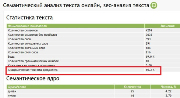Академическая тошнота документа, она должна быть в пределах 8-10%. Если меньше – частота ключевых слов недостаточная и конкуренты вас легко обойдут. Если более 10% – текст перенасыщен ключами и существует риск попасть под санкции поисковых систем за переспам.
