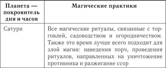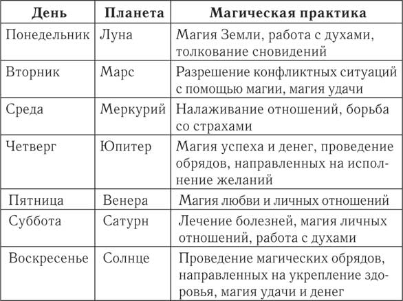 Ниже приведена таблица соответствия дней недели и влияющих на них планет.