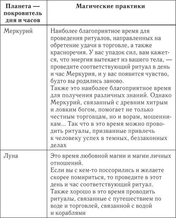 Стоит обратить внимание и на часы. П. Пиобб советует с просьбами обращаться в часы Сатурна, Марса, Меркурия и Луны, любовные ритуалы проводить в часы Сатурна и Марса, значительные магические действия совершать в часы Юпитера и Венеры, а изготовлять пентакли в часы Меркурия.
