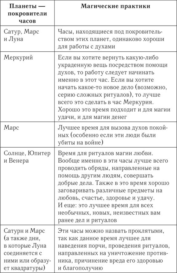 Знайте также, что существуют духи различного порядка, некоторые из них управляют небесами, другие подчинены планетам, третьи пребывают в элементах Огня, Воздуха, Воды и Земли. Есть определенное время для вызывания этих духов, дни и часы, когда они имеют наибольшую силу и особую власть.