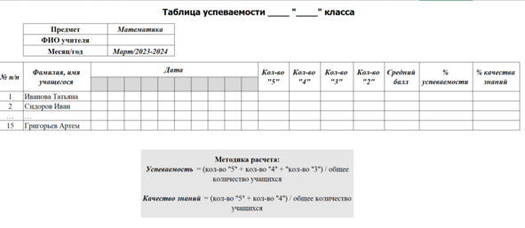 Создать таблицу успеваемости по математике на март текущего учебного года (в классе 15 человек, а занятия два раза в неделю). Провести анализ успеваемости класса.