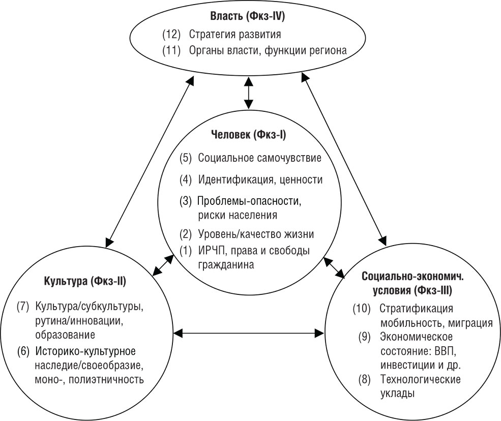 Таким образом, учитывая сложность и многоаспектность социокультурного развития региона, его целесообразно изучать во всем многообразии его свойств. Такую возможность дает типовая программа, разработанная ЦИСИ ИФ РАН под руководством члена-корреспондента РАН Н. И. Лапина, – методика «Социокультурный портрет региона». Так, для комплексного изучения региона в соответствии с принципами антропосоциентального подхода можно выделить 4 кластера, или композитных фактора (рис. 1.1).