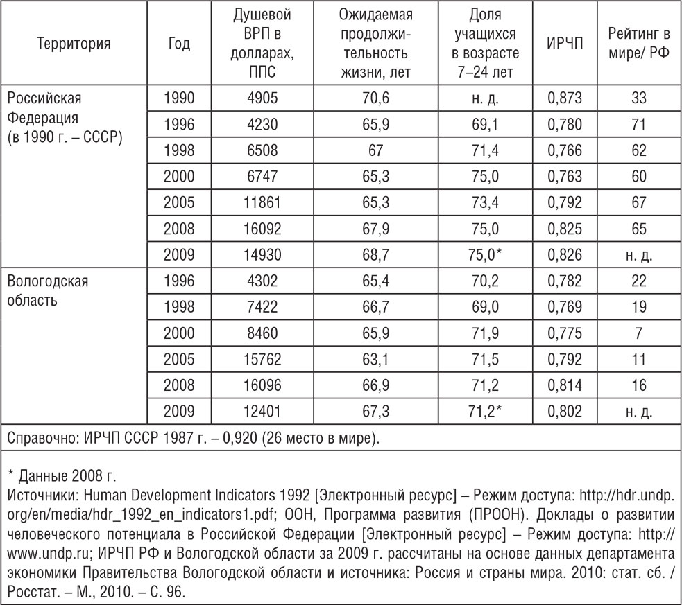 Таблица 1.1. ИРЧП и его составляющие: население Российской Федерации и Вологодской области, 1990–2009 гг.