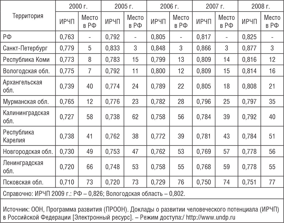 Таблица 1.2. Индекс развития человеческого потенциала Вологодской области и регионов СЗФО, 2000–2008 гг.