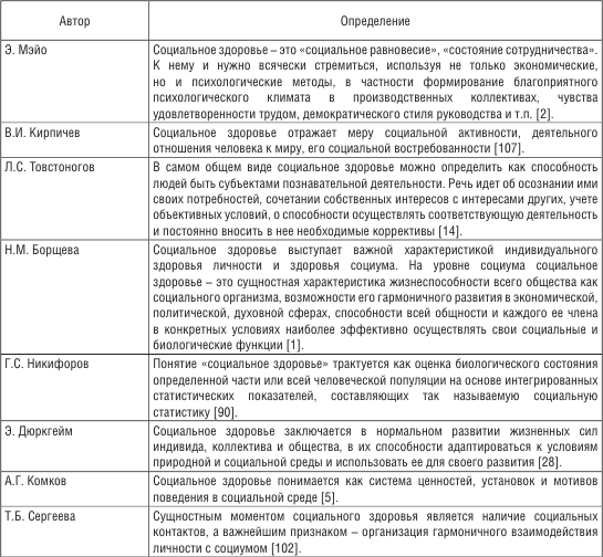 Таким образом, анализ различных теоретико-методологических подходов к пониманию сущности социального здоровья дает возможность сделать вывод о том, что современное, мультидисциплинарное понимание социального здоровья сложилось относительно недавно. Одни ученые по-прежнему рассматривают социальное здоровье в русле «медицинской теории» (Г.Л. Волков, Н.И. Уткин, К.Н. Хабибуллин). Другие сводят анализ социального здоровья к поиску корреляционных связей между состоянием физического здоровья и социальными характеристиками (доходы, общественный статус и т. д.). Вместе с тем изучение социального здоровья общества как целостной системы, состоящей из отдельных подсистем и обеспечивающей длительное и благополучное состояние общества, находится на стадии формирования и систематизации комплекса знаний, накопленных в рамках различных научных дисциплин.
