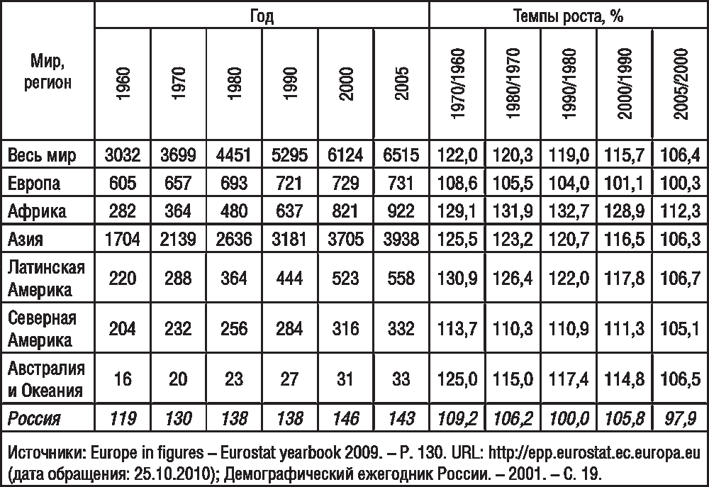 Тем не менее темпы роста мирового населения постепенно сокращаются (табл. 1.1). За последние четыре с половиной десятилетия они снизились с 22 до 6 %. Наиболее выражена данная тенденция в Европейском регионе (с 9 % в 1960–1970 гг. до нуля в 2000–2005 гг.) и Северной Америке (с 14 до 5 % соответственно). В Российской Федерации численность населения возрастала в период с 1990 по 2000 г. за счет большого миграционного притока из бывших союзных республик, но с начала XXI в. она приобрела отрицательную динамику, снизившись за пять лет первого десятилетия на 2 %.