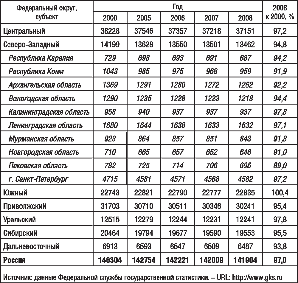 В результате в период с 2000 по 2008 г. население России сократилось на 3 % (с 146 до 142 млн. человек, табл. 1.3). Демографические процессы в 85 % регионов страны имеют депопуляционный характер.