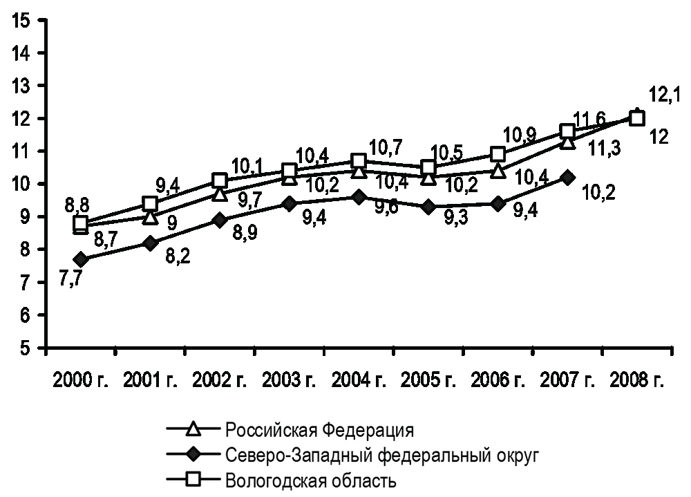 В период с 2000 по 2008 г. в целом по Российской Федерации отмечаются положительные тенденции изменения демографической ситуации: снижение смертности, особенно младенческой (с 16,0 на 1000 чел. родившихся живыми в 2000 г. до 8,5 в 2008 г.), и достаточно устойчивое повышение общего коэффициента рождаемости (с 8,7 чел. на 1000 чел. населения в 2000 г. до 12,1 в 2008 г., табл. 1.2.), рост брачности (c 6,2 на 1000 чел. населения в 2000 г. до 8,3 в 2008 г., прил. 4