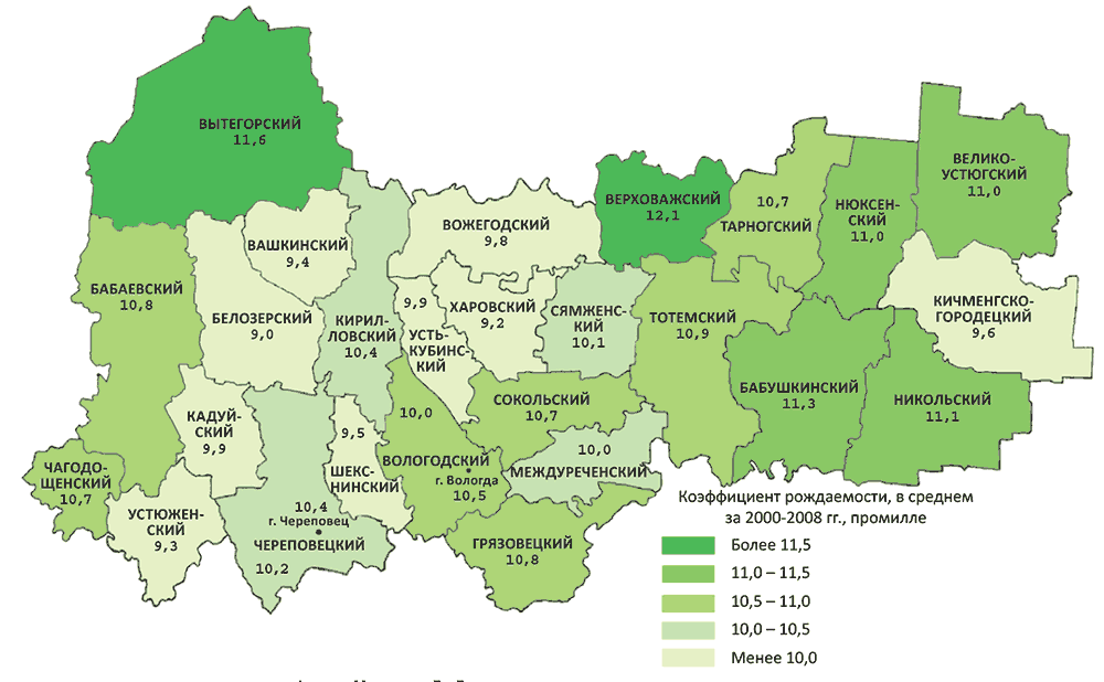 Рис. 1.3. Общий коэффициент рождаемости населения Вологодской области, в среднем за 2000–2008 гг., промилле