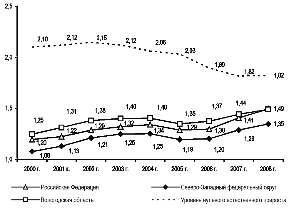 Величина суммарного коэффициента рождаемости не зависит от возрастного состава населения и характеризует средний уровень рождаемости в данный календарный год. Этот показатель дает более точное представление о детности и отражает средние репродуктивные установки населения. В период с 2000 по 2008 г. суммарный коэффициент рождаемости увеличился с 1,2 до 1,5, однако в течение этих восьми лет он не обеспечивал уровня нулевого естественного прироста[13] (рис. 1.4).