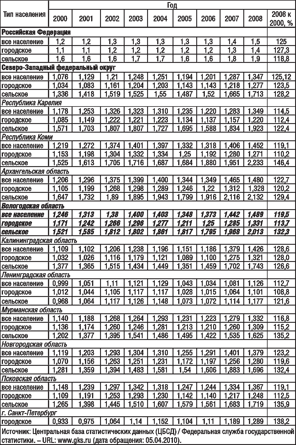 Источники: Регионы России, 2008: стат. сб. / Федеральная служба государственной статистики. URL: www.gks.ru; Демографический ежегодник Вологодской области: стат. сб. / Территориальный орган Федеральной службы государственной статистики по Вологодской области, 2009.