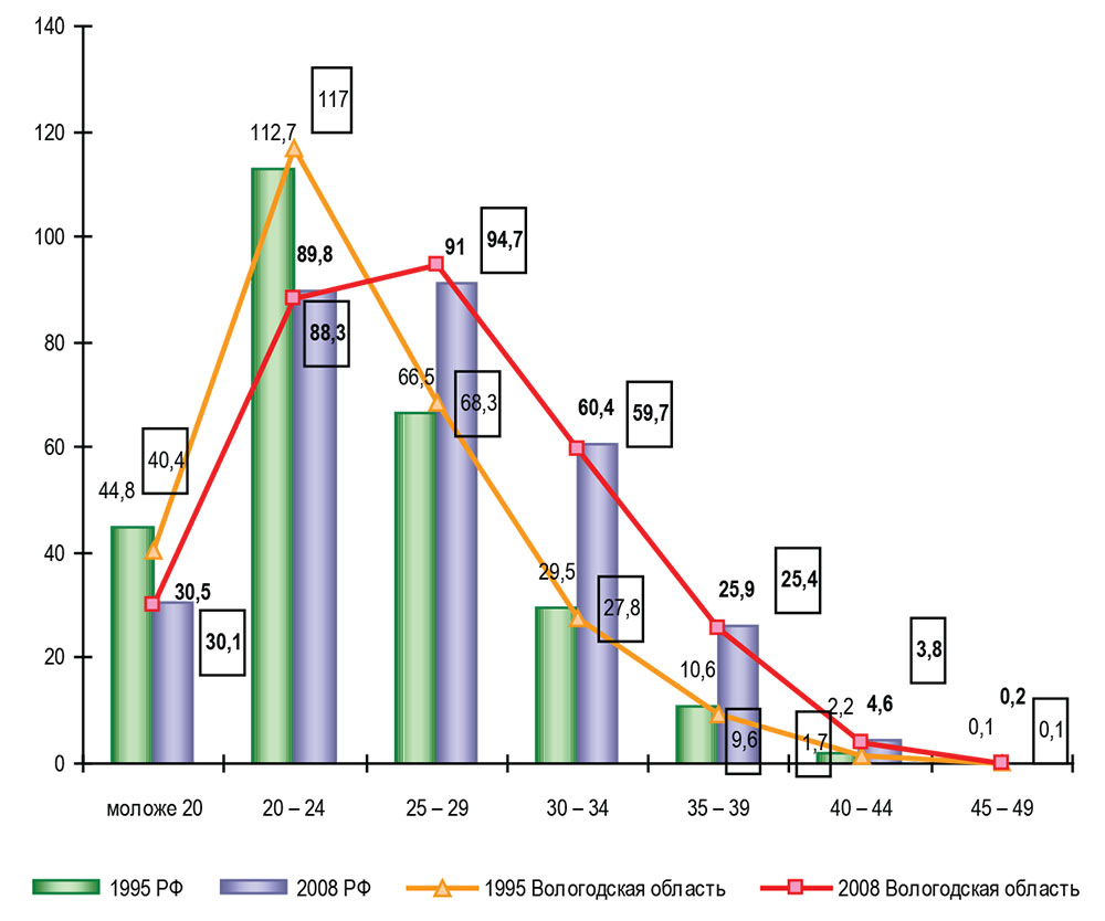 Современная Россия, несмотря на патриархальность взглядов, также демонстрирует в последние годы (2005–2008] аналогичные процессы (рис. 1.5). «Пик» рождаемости в 1995 г. приходился на женщин в возрасте 20–24 года, в 2008 г. он фиксируется в группе 25 – 29-летних женщин. Кроме того, параллельно произошло снижение числа рождений в группе моложе 20 лет (с 44,8 до 30,5 на 1000 женщин соответствующего возраста] и увеличение числа рождений в старших возрастных группах (30–34 лет, 35–39 и 40–44 лет].