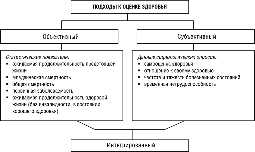 В международной практике принято выделять два подхода к оценке здоровья: объективный и субъективный (рис. 1.2). Объективный подход – оценка здоровья внешним наблюдателем, экспертом с помощью специальных инструментов в рамках специализированных обследований (данные официальной статистики). Объективно состояние здоровья оценивается на основании анализа демографических показателей, таких как коэффициенты смертности по возрастам и причинам смерти, ожидаемая продолжительность жизни и др.; медицинской документации и показателей, например, заболеваемости острыми и хроническими болезнями, обращаемости в медицинские учреждения, сведений о проведённых профосмотрах и диспансеризациях и т. д.
