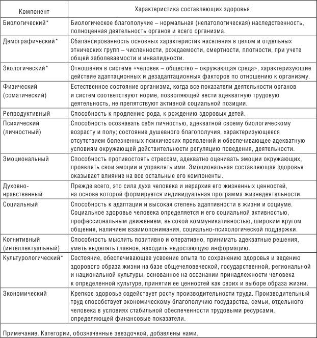 Обобщение современных представлений о здоровье, получаемых из различных отраслей знаний, дает возможность сформировать его структуру, выделив составные части: духовно-нравственный компонент, биологический, социальный, интеллектуальный, эмоциональный, репродуктивный, физический, экономический и др. (табл. 1.1). Все компоненты взаимосвязаны.
