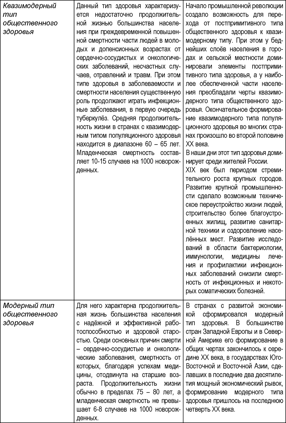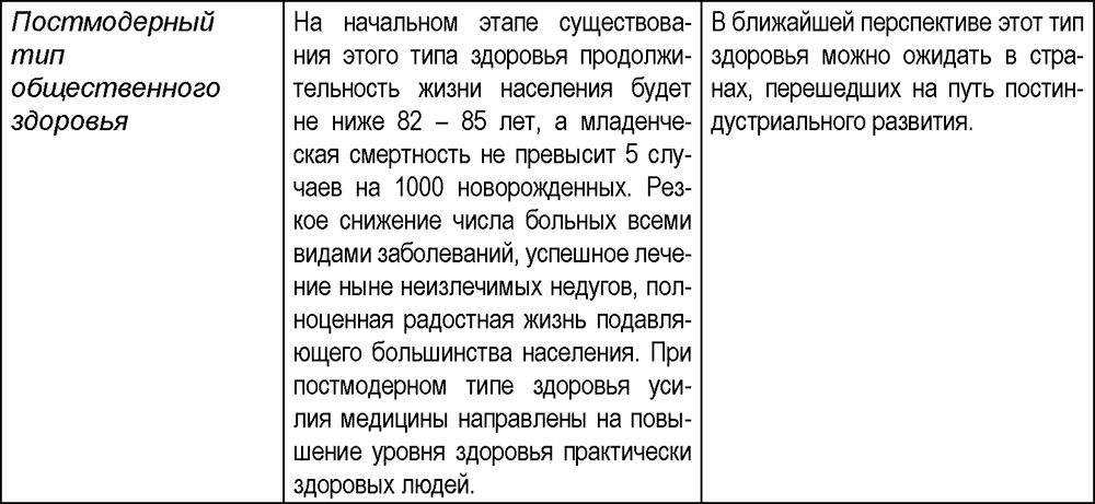 В рамках классификации Б. Б. Прохоровым выделено пять типов популяционного здоровья. Из характеристики типов здоровья, приведённой в таблице 1.3, следует, что человеческие общности в процессе своей эволюции последовательно сменили 1-й тип здоровья на 2-й, потом на 3-й и 4-й. Наиболее экономически развитые страны стремятся сформировать 5-й – наиболее прогрессивный тип здоровья. Но, к сожалению, на Земле существуют человеческие общности, в которых доминируют примитивный или постпримитивный типы здоровья. В России в настоящее время преобладает квазимодерный тип, в отличие от развитых государств, где господствует модерный тип здоровья.