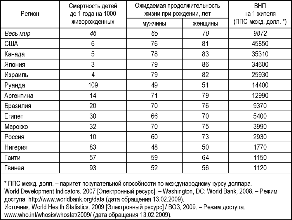 Младенческая смертность, средняя продолжительность жизни и валовой национальный продукт в России, мире и некоторых странах (2007 г.)