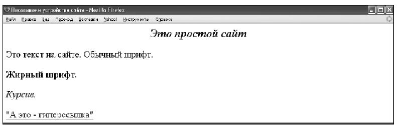 Надо сказать, что язык HTML достаточно прост и логичен. Он представляет собой способ разбивки текста с помощью специальных элементов – тегов, которые определяют структуру и внешний вид текста при просмотре его в браузере. О тегах следует знать, что они всегда парные и что они бывают открывающими (обозначают начало определенного форматирования) и закрывающими (обозначают его окончание). Закрывающий тег – такой же по написанию, как открывающий, но перед ним стоит косая черта. Приведем пример очень простого сайта (рисунок 1).