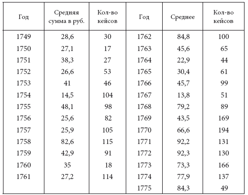 Подтвердить, или опровергнуть эту гипотезу могли бы данные о размере сделок. В целом за весь рассматриваемый период их размер колебался от одного до 2300 рублей.[54] Подавляющее же число векселей в нашей базе данных выписаны на сумму, не превышающую 100 руб. Если же брать среднюю сумму сделки по отдельным годам, то надо иметь в виду, что она в значительной мере зависит от наличия или отсутствия среди векселей за данный год выписанных на крупные суммы (свыше ста рублей). Помимо этого, естественно, во внимание стоит принимать лишь тот период, когда число зафиксированных векселей приобретает сколько-нибудь значимые величины, т. е. с 1749 г. Как видно из Таблицы 3, средняя сумма сделок колеблется от 14,5 руб. в 1754 г. до 92,3 руб. в 1772 г. При этом, если до 1770 г. средние суммы сделок по годами сильно разнятся, то в 1770–1775 гг. они вполне сопоставимы. Увеличение же числа опротестованных векселей в 1753–1754 и 1768–1769 гг. на средней величине сделок не сказалось.