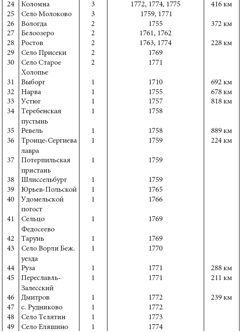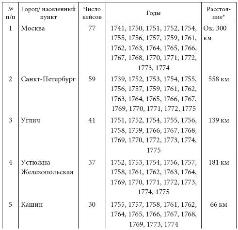 Как легко заметить, лидируют в этом списке основные торговые центры страны – Москва и Санкт-Петербург, на которые приходится примерно 31,5 % всех векселей, составленных вне Бежецка. Попавшие в этот список другие города расположены преимущественно в современных Тверской, Костромской, Новгородской, Ярославской, Московской и Вологодской областях, то есть охватывающих центральную и северо-западную Россию. Здесь же расположены и более мелкие населенные пункты. Так, Опеченская пристань – это село Новгородской области (ныне – Опеченский Посад) на правом берегу р. Меты, к юго-востоку от Боровичей, которое было важным лоцманским центром Вышневолоцкой водной системы. К этой же системе относилась и Потерпильская пристань. Удомля в настоящее время – это город на границе Тверской и Новгородской областей. Теребенская, или, правильнее, Николо-Теребенская пустынь находится в непосредственной близости от Бежецка. Определить, какая именно Рыбная слобода упоминается в бежецких документах, довольно сложно, поскольку это и название нынешнего города Рыбинска, и слободы Переславля-Залесского. Также не представляется возможным определить, какая именно Борисоглебская слобода, на которую приходится восемь векселей, имеется в виду. Вероятно, это также часть Переславля-Залесского, являвшаяся до 1764 г. монастырской слободой. Но одноименные слободы находились и под Ростовом и Ярославлем. Наиболее отдаленная точка – Ревель, в котором зафиксирован только один вексель.