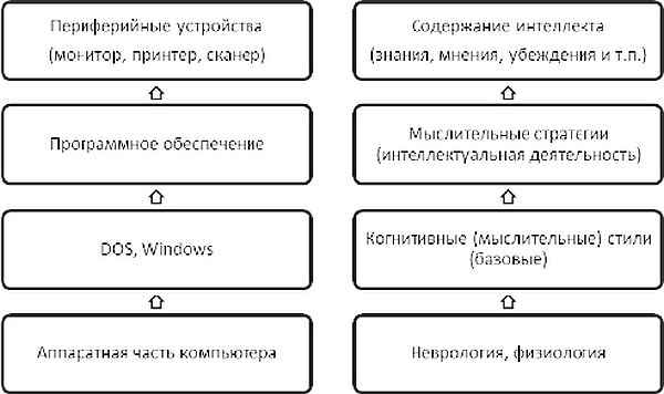 Наглядно это может быть представлено по аналогии с принципом обработки информации компьютером (рис. 1.), где уровни от физиологического до мыслительных стратегий включительно являются лишь структурой интеллекта, отвечающих за то, как, каким именно способом человек воспринимает, отбирает, фиксирует и обрабатывает информацию, и лишь сумма накопленных человеком знаний, умений, опыта, сформированных представлений, убеждений и ценностей составляют продуктивную часть интеллекта или его содержание.