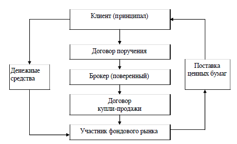 Брокер на основании договора поручения оказывает клиенту услуги по покупке ценных бумаг. Найдя на рынке бумаги, которые нужны клиенту, брокер от имени клиента заключает договор с владельцем ценных бумаг, который поставляет ценные бумаги, а клиент со своего счета оплачивает их приобретение. За свои услуги брокер получает комиссионное вознаграждение. Если клиент дает поручение продать ценные бумаги, то сделка совершается по такой же схеме, только клиент поставляет ценные бумаги покупателю, а последний осуществляет их оплату.