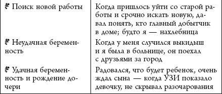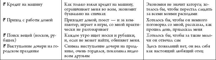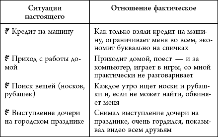 Неправда ли, на основе этих двух столбцов складывается не слишком хорошее мнение о муже моей клиентки? За исключением, разве что, последнего пункта: если гордится за свою дочь, значит, любит ее. Теперь давайте посмотрим, что написала моя клиентка в третьем столбце: