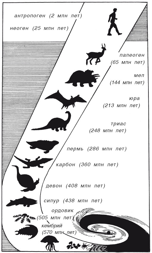 Время от времени нам придется заглядывать в этот «путеводитель», следуя путем развития жизни, как бы продвигаясь по залам необычного музея. Наш «путеводитель» – таблица летописи Земли.