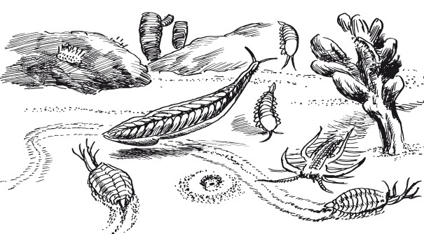 По дну медленно проползали трилобиты, первые ракообразные и улитки. В рыхлый грунт зарывались двустворчатые моллюски. Там же копошились различные черви, не имевшие твердых скелетов и раковин, и поэтому мы можем судить о них только по оставшимся норкам и ходам. В толще воды «парили» зонтикообразные медузы, солнцеподобные одноклеточные корненожки, мелкие рачки и другие животные с легкими студенистыми телами, которые, не сопротивляясь движению водных потоков, уносились водой на огромные расстояния.
