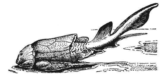Но наиболее многочисленны и разнообразны в девонских морях были рыбы. Недаром девонский период называют «веком рыб». Такому разнообразию позавидовал бы любой рыболов. Многие из них выглядели, как неповоротливые средневековые рыцари: они были закованы, словно в латы, в толстые панцири, состоявшие из нескольких костных пластин. То и дело в океане можно было увидеть рыб причудливой формы с не менее причудливыми плавниками. Рыбы не только поедали друг друга, но и становились добычей огромных (иногда длиной около 9 м) головоногих моллюсков-спрутов, напоминавших кальмаров, но живших в прямых или закрученных раковинах. Эти моллюски обладали способностью самостоятельно передвигаться в толще воды с большой скоростью, поэтому поймать рыбу им было несложно.