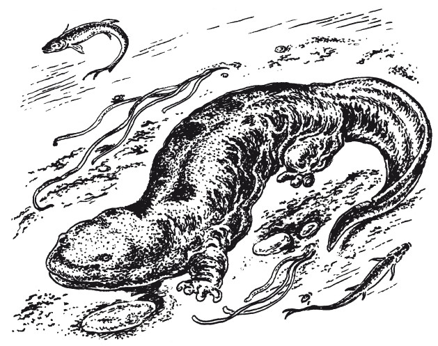 Напомним, что первыми завоевателями суши среди животных были пауки и прочие членистоногие. Настало время и позвоночным животным осваивать наземную среду. И это величайшее событие произошло в девоне. Амфибии, или земноводные, еще чем-то смахивающие на рыб, первыми появились на суше в конце девонского периода. Их предками были кистеперые рыбы.