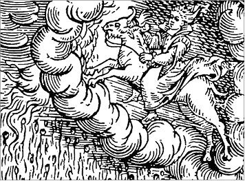 Затем к новоявленной ведьме в качестве помощника и любовника приставлялся черт, который мог в виде огненного смерча влетать в трубу ее дома. Да и сама ведьма нередко вылетала из трубы на метле.