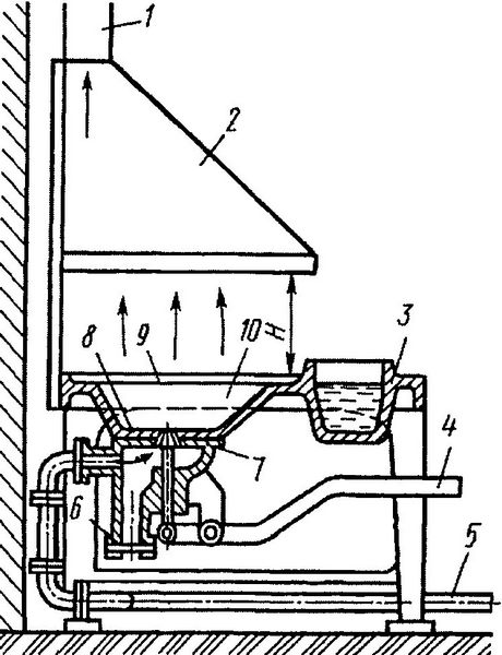 Рис. 1.1.2. Стационарный горн с литым постаментом: 1 – вытяжная труба; 2 – зонт; 3 – бачок с водой для охлаждения инструмента; 4 – рычаг для регулирования подачи воздуха; 5 – воздухопровод; 6 – заслонки; 7 – конический запорный наконечник; 8 – фурма; 9 – литой стол; 10 – очаг.