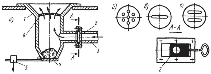 Рис. 1.1.3. Литая фурма (а) со сменными колосниковыми решетками (б, в, г): 1 – корпус фурмы; 2 – заслонка; 3 – подводящий патрубок; 4 – донная крышка; 5 – груз; 6 – колосниковая решетка.